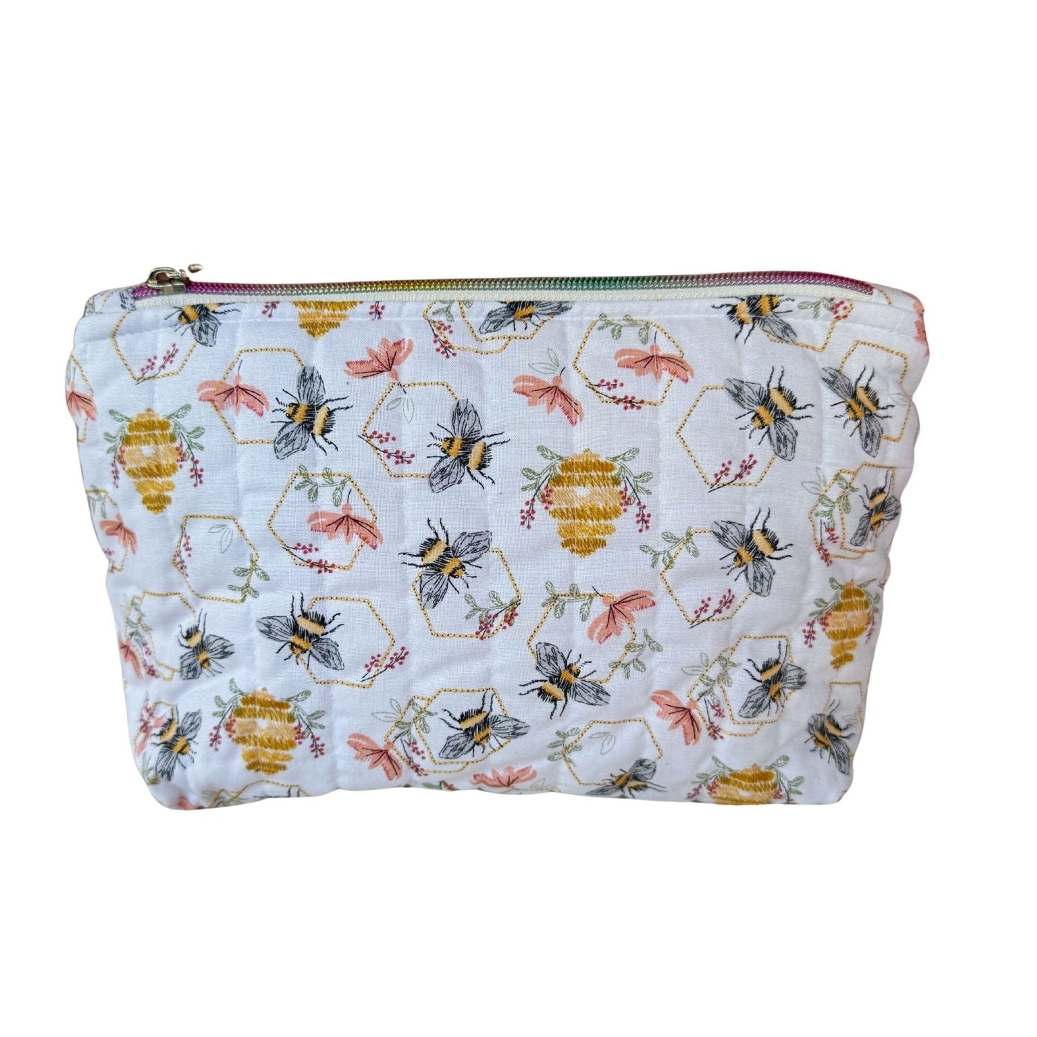 This Bee Hive Quilted Makeup Bag is a great bag to hold your makeup, hair products and much more.