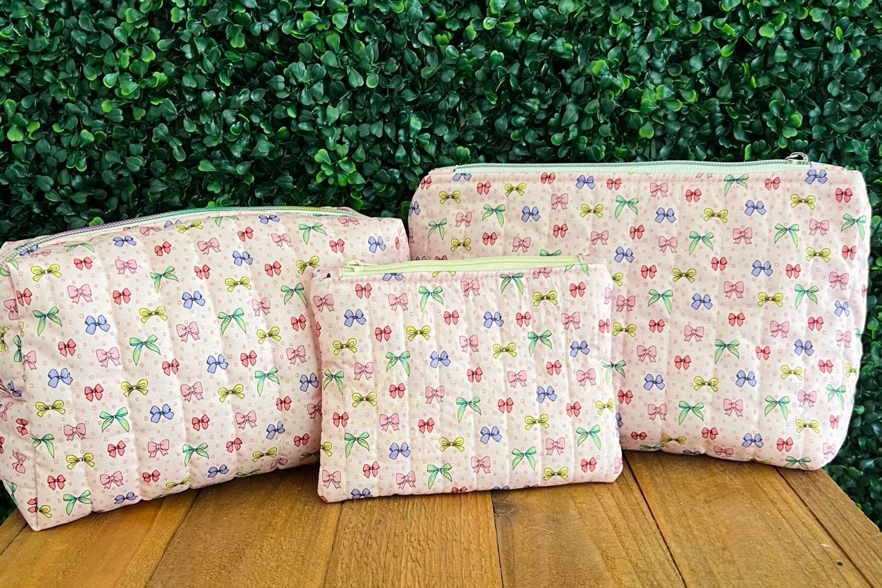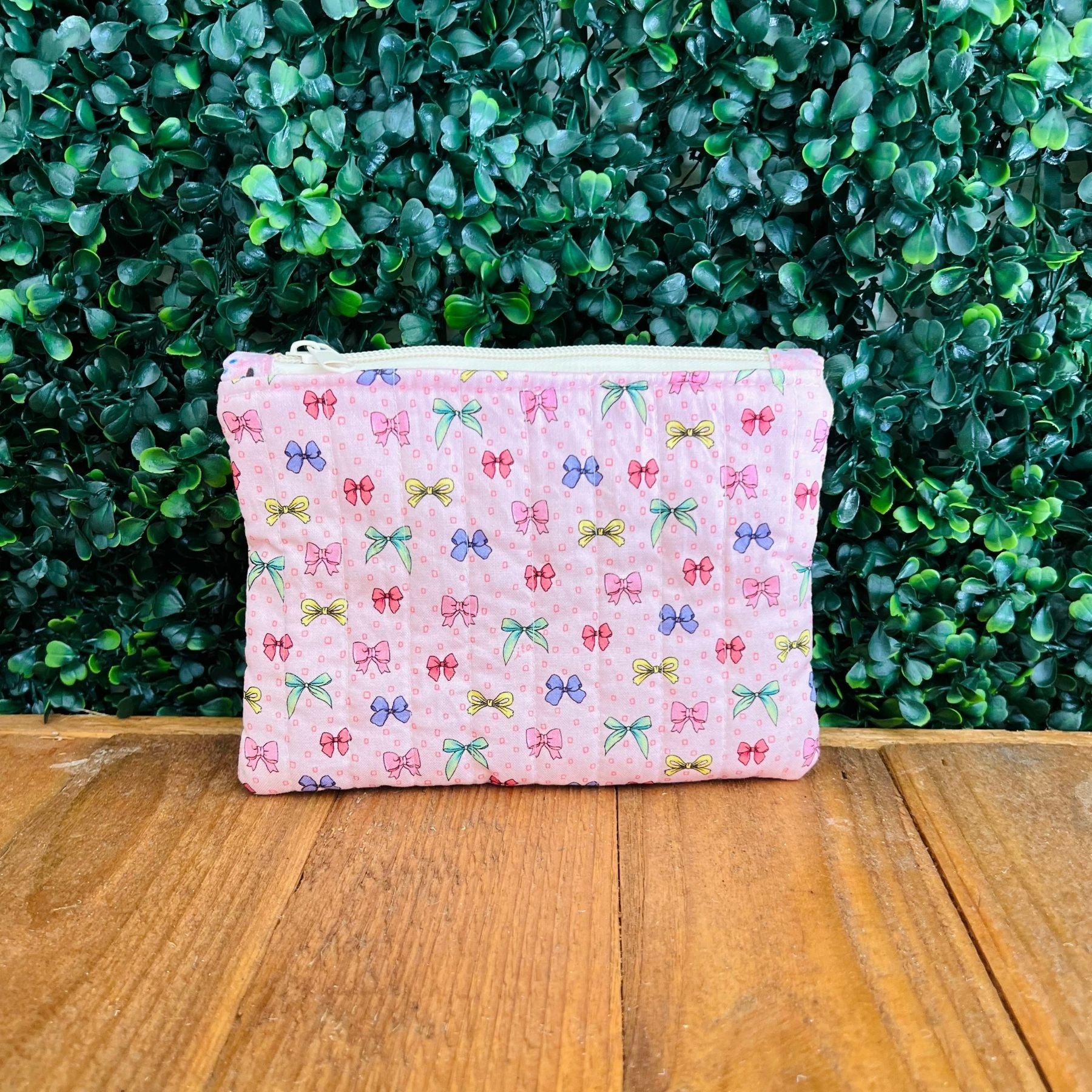 This Pink bows quilted zip pouch is a great bag to hold your money, chapstick, ID's and more.