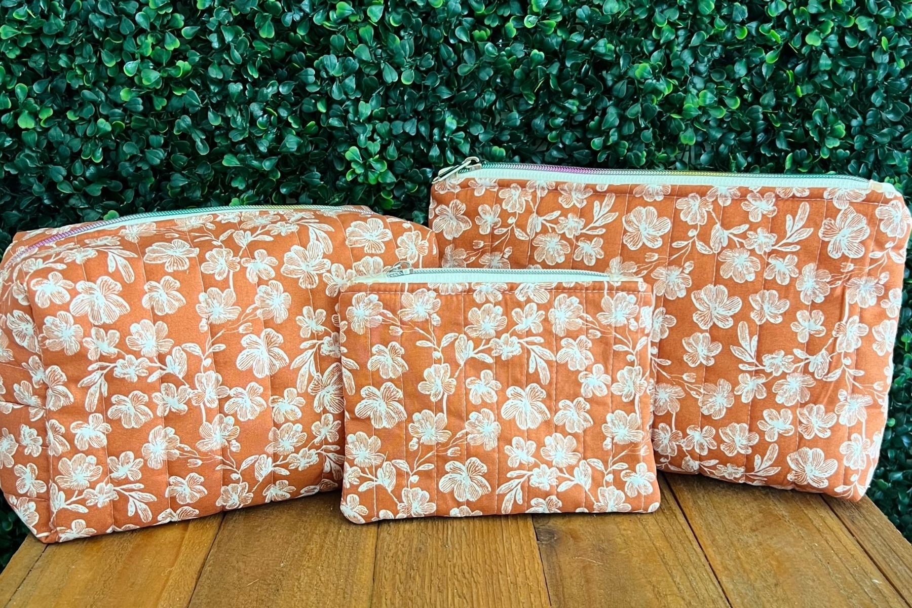 This Rust Floral quilted zip pouch is a great bag to hold your money, chapstick, ID's and more.